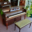 The cabinet is quite unique in that it features four legs....which really adds an element of sophistication. Furthermore, there is an original set of pristine ivory keys on this piano. They are nice and white with no chips! It is quite unusual to find a piano this age with perfect keys. Also, the original bench is in great shape, too. Benches often get used as "extra seating" for Thanksgiving or other parties when you need more chairs. To find a piano bench that is still solid after this much time is an extra bonus. The lady who gently cared for this instrument for so many years upholstered the top of the bench. I am not sure what the "needlework" is called....that isn't my area of expertise. It adds quite a bit of "wow" to the piano. If it is too exciting for your taste, it can easily be changed out to something more subtle.